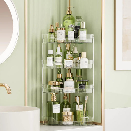 TidyStash 4-Tier Corner Bathroom Counter Organizer Diamond-Shaped Bathroom Countertop Organizers and Storage Corner Makeup Organizer Corner Vanity Organizer for Skincare Perfume Cosmetics Clear